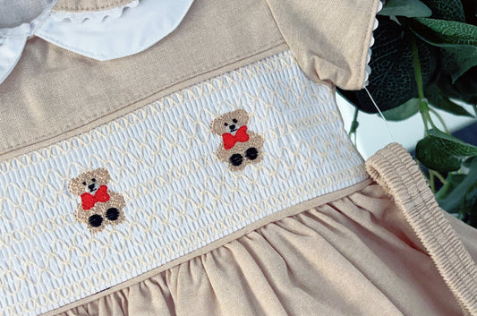 Baby girls traditional “Teddy” smocked dress with knickers and headband