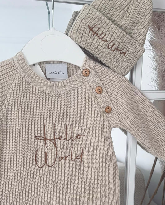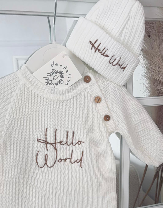 Baby knitted romper with hat “Hello world”