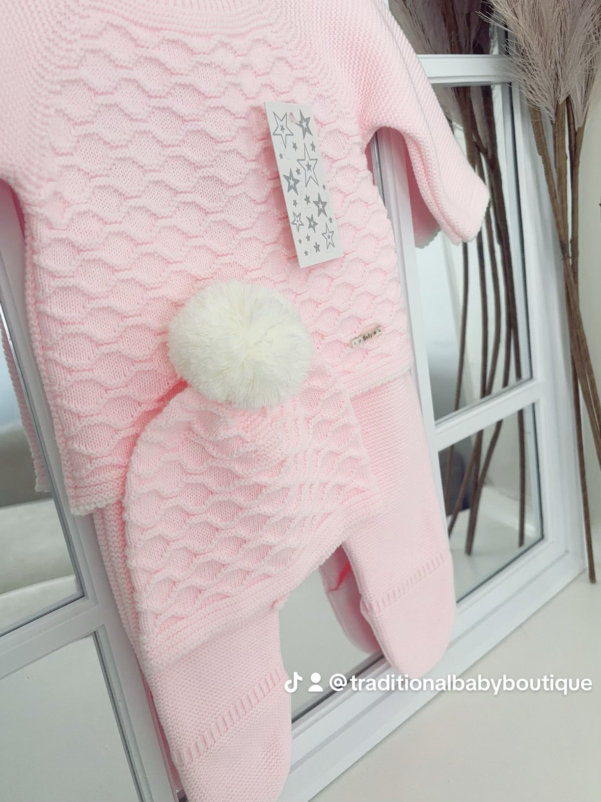 Indulge your little one with our luxurious honeycomb knitted set. Complete with an adorable pom pom hat, this set keeps your baby girl cozy and stylish. Make her stand out with this exclusive ensemble. Perfect for any occasion.