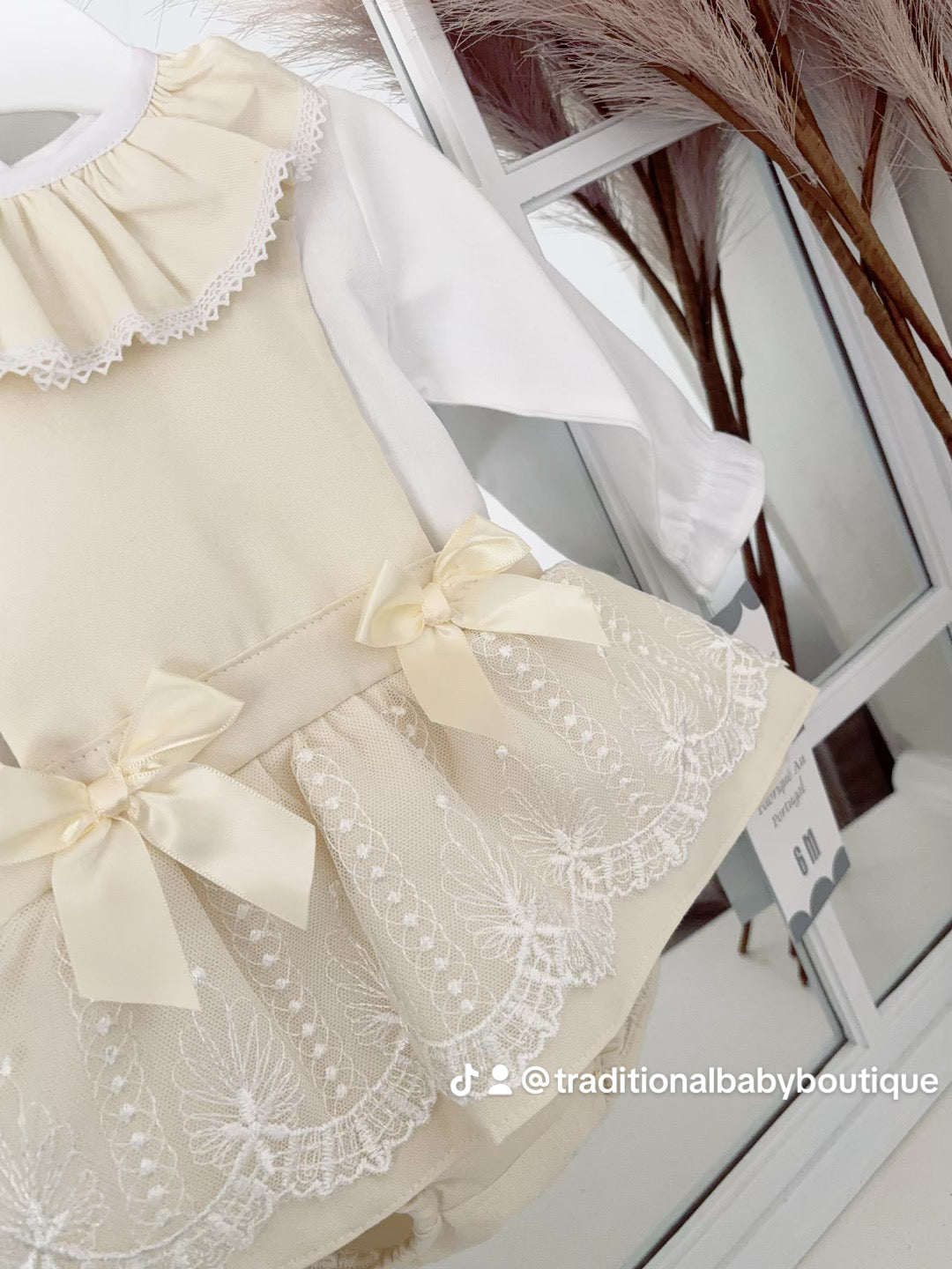 Indulge your little one in luxury with our “Penelope” lace pinafore dress and blouse set. Made with delicate lace and a matching blouse, this set exudes elegance and sophistication. Perfect for special occasions or everyday wear, your baby girl will look and feel like a true princess.