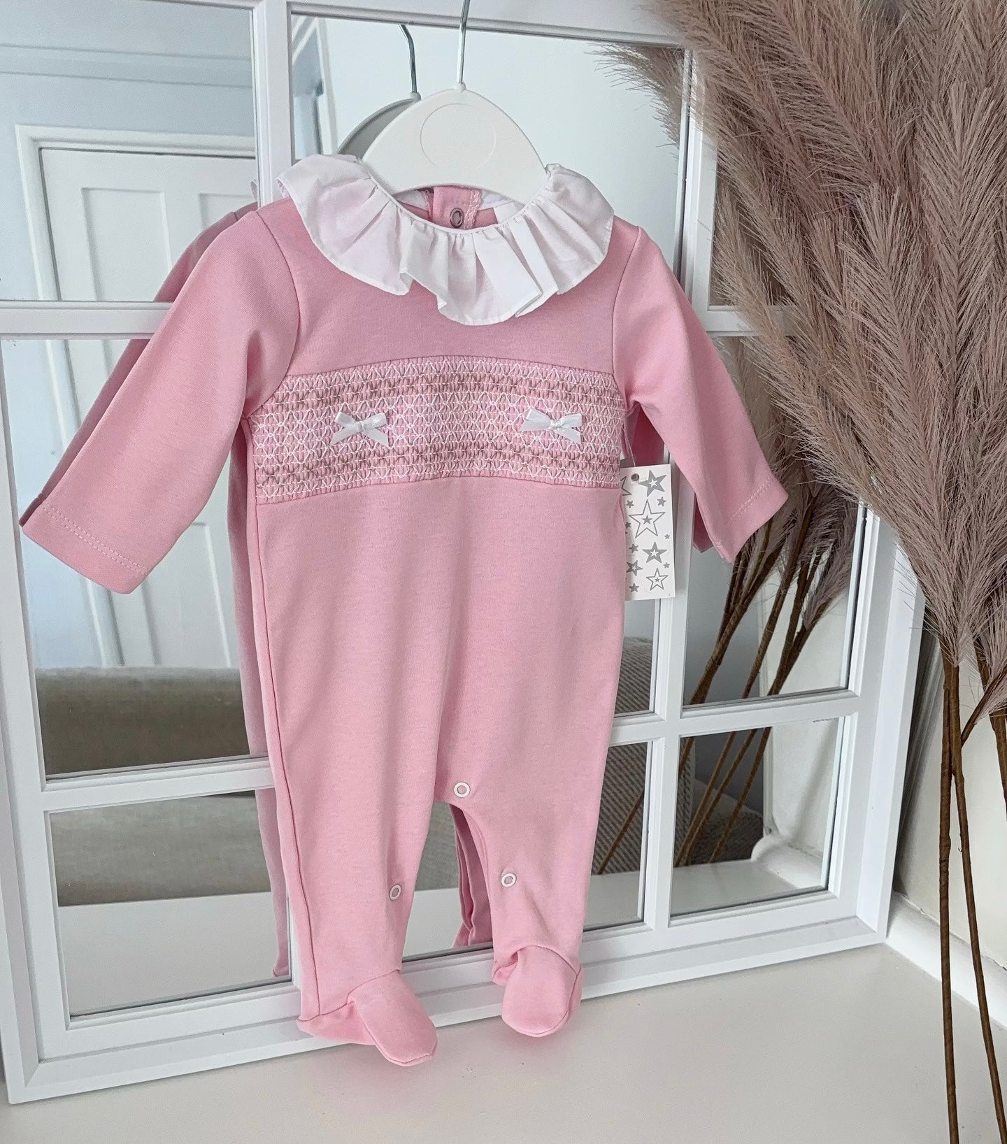 Indulge your little princess in this luxurious pink smocked all in one with a delicate frilled collar. Crafted from soft cotton, this piece exudes sophistication and charm. Perfect for any occasion, dress your baby girl in style and comfort.
