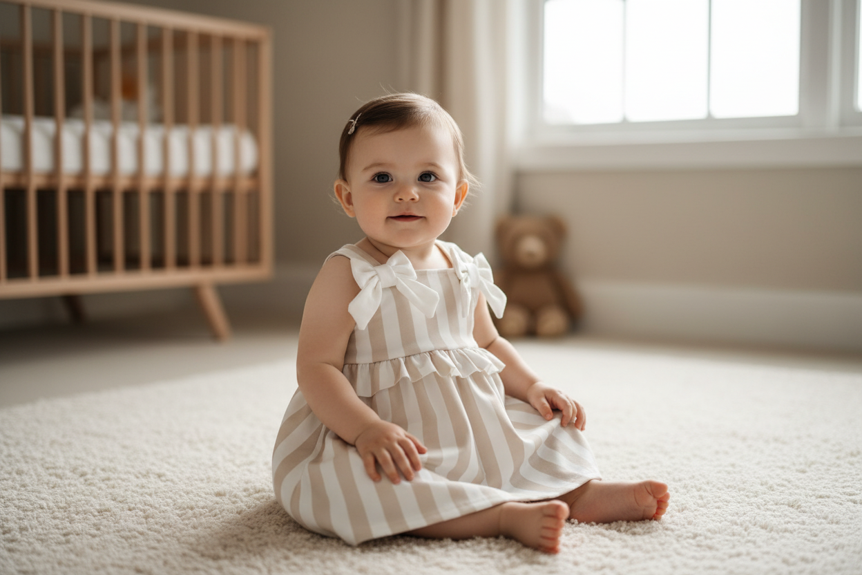 Dress your little princess in luxury with our baby girls stripe dress. Made with soft, high-quality fabric, this dress features a charming stripe pattern and double bow detail. Perfect for any occasion, your little one will look elegant and stylish in this exclusive dress.