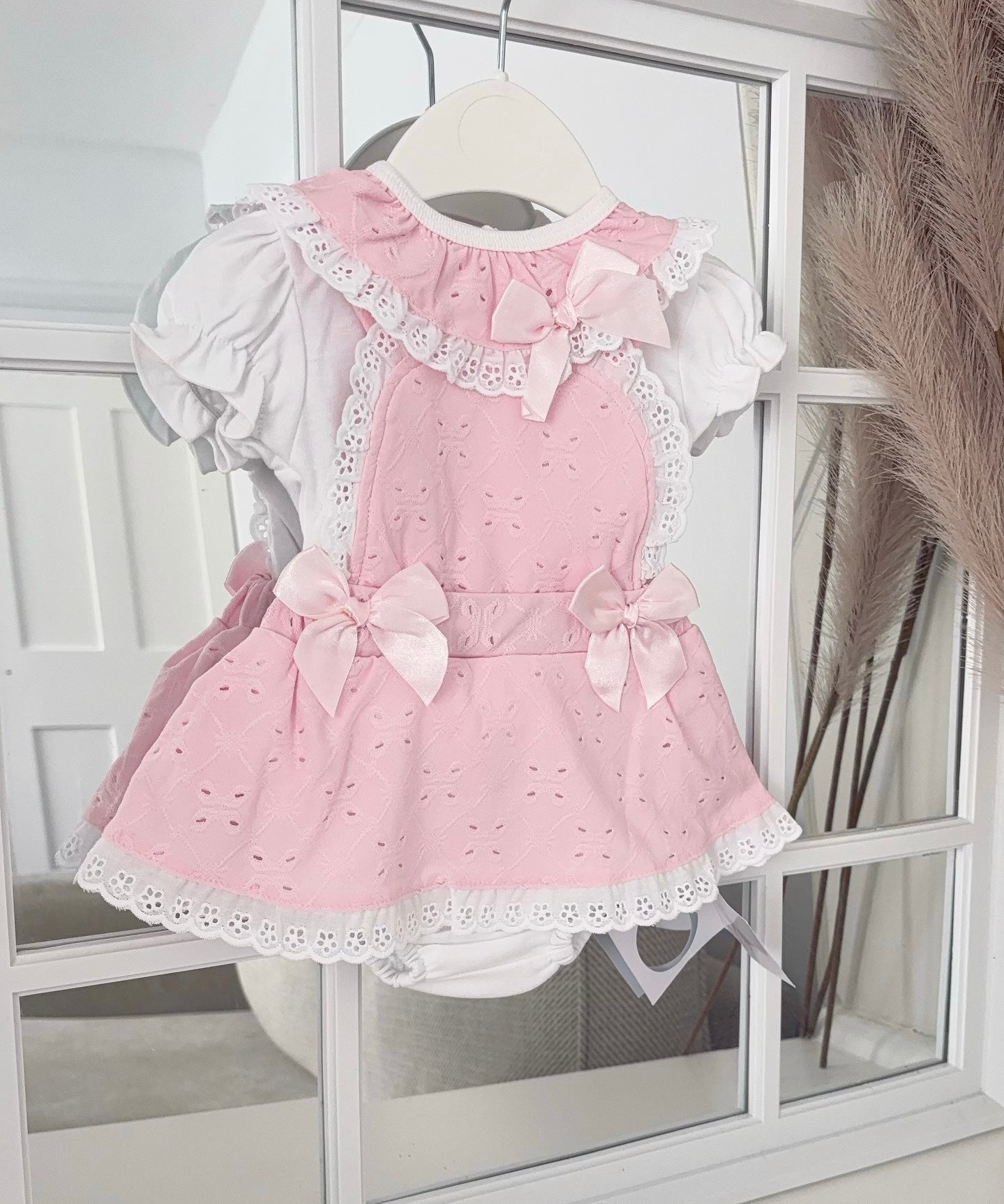 Introducing our Broderie Anglaise Pinafore Set, a luxurious and sophisticated ensemble perfect for any occasion. The short sleeve top features a delicate frilly collar adorned with lace trim and ribbon bow, while the pinafore boasts intricate broderie anglaise and matching lace trim and ribbon bows. Elevate your wardrobe with this exclusive set.